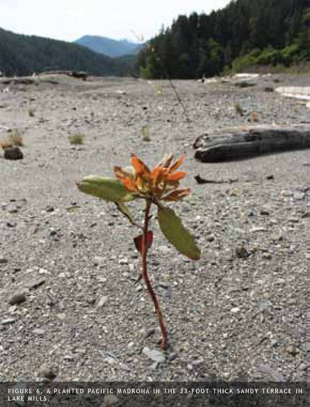 Revegetation of the nearly 800 acres that will eventually be exposed is a primary goal of the Elwha Ecosystem Restoration Project. The Elwha Revegetation Project is a joint effort between Olympic National Park (ONP) and the Lower Elwha Klallam Tribe. Revegetation will be challenging, since the reservoirs have been accumulating inorganic sediments for nearly 100 years. Just under half of the sediments are fine-textured silts and clays. The fine sediments are 1-5 feet thick on the upper valley slopes of the former lakebed (Figure 1) and as much as 40 feet deep on the reservoir floor, the future valley bottom. Along the original shoreline the sediments are shallow, less than an inch at some sites. The only known plant life forms to colonize fine-textured surfaces are graminoids (rushes, sedges and grasses). The other half of the sediments are coarse textured (sands, gravels, and cobbles). Most of the coarse sediments are in Lake Mills and form the Lake Mills delta, which was nearly a mile long and 70 feet thick prior to the start of dam removal. The slow pace of dam removal is designed to allow the river to erode the delta forward into the reservoir, leaving 10-20 feet of sands and gravels covering the entire valley bottom, which is more than 2 miles long! This advancing delta will cover the existing layers of fine lake sediments that are 10-40 feet thick on the reservoir floor, creating new terraces 20-60 feet deep. Once dam removal is complete, the river will cut though the terraces and create a relatively wide floodplain on the original valley floor. However, Lake Mills inundated a wide valley, and remnant terraces will remain after dam removal is complete. We estimate that 30-40% of the valley bottom (130-175 acres) will be covered in deep terraces of lake sediments. Already terraces more than 20 feet high have formed during the early stages of dam removal (Figure 2). Thick terraces high above the water table and deep layers of silt and clay will be challenging surfaces for plant establishment.