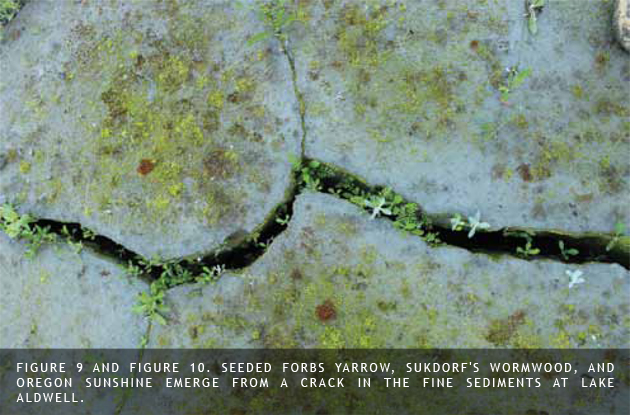Blue wildrye (Elymus glaucus), slender hairgrass (Deschampsia elongata), common yarrow (Achillea millefolium), Sukdorf’s wormwood (Artemsia suksdorfii) and Oregon sunshine (Eriophyllum lanatum) have germinated and provided significant plant cover over deep deposits of fine sediment (Figure 9). Cracks in the sediments are already proving to be safe sites for seedlings (Figure 10), similar to safe sites that formed on Mount St Helens after the 1980 eruption.